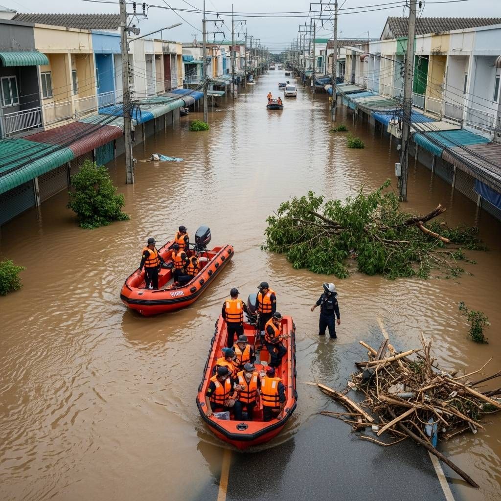 Volunteer boats aiding Hat Yai flood victims robbed at gunpoint, losing pumps and fuel; delay left 400 families stranded. Police add patrols to secure rescues.