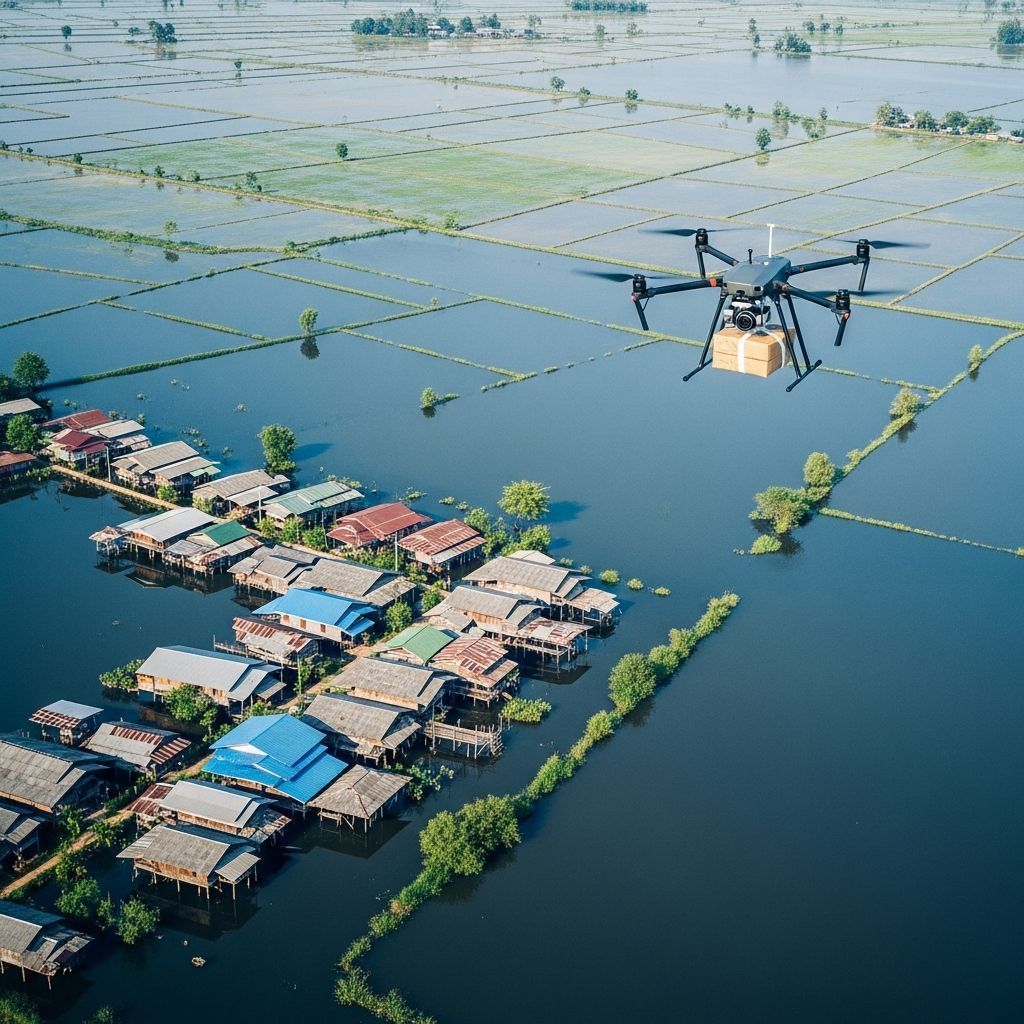 With eased flight rules, drones now fly day and night to drop food, medicine and power banks to remote, flood-hit villages across Southern Thailand.