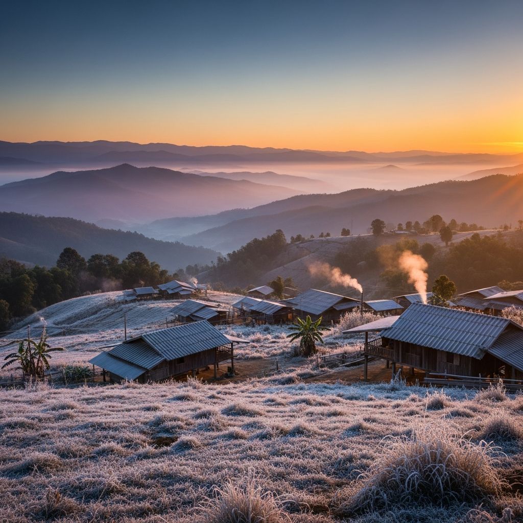 A reinforced high-pressure dome has planted itself over upper Thailand, funnelling dry northeast winds at 10-25 km/h across rice fields and teak forests alike. That conveyor belt of air, born over the Chinese mainland, dragged ground temperatures in Mae Fah Luang district to a season low, while stations on Phu Chi Fa clocked morning readings between 4-8 °C. Trekkers on Doi Inthanon even reported a thin film of น้ำค้างแข็ง—the needle-thin ice locals call mae-kaning.